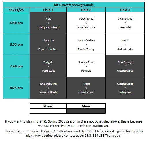 Mt Gravatt Monday games have been moved to Somerfields, Rocklea. Information has been sent to your captain.